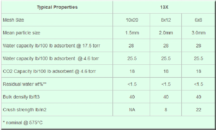 13X bead products provide superior adsorption capacity for a wide range of polar organic compounds that could cause catalyst deactivation and other performance problems. These compounds include sulfur-based molecules such as mercaptans, sulfides, and disulfides; nitrogen-based molecules such as nitriles, amines, amides, and pyridines; oxygenated hydrocarbon molecules such as alcohols, glycols, aldehydes, ketones, ethers, and peroxides; and other compounds such as water, carbon dioxide, ammonia, hydrogen sulfide, benzene, trace olefins, and polycyclic aromatics.